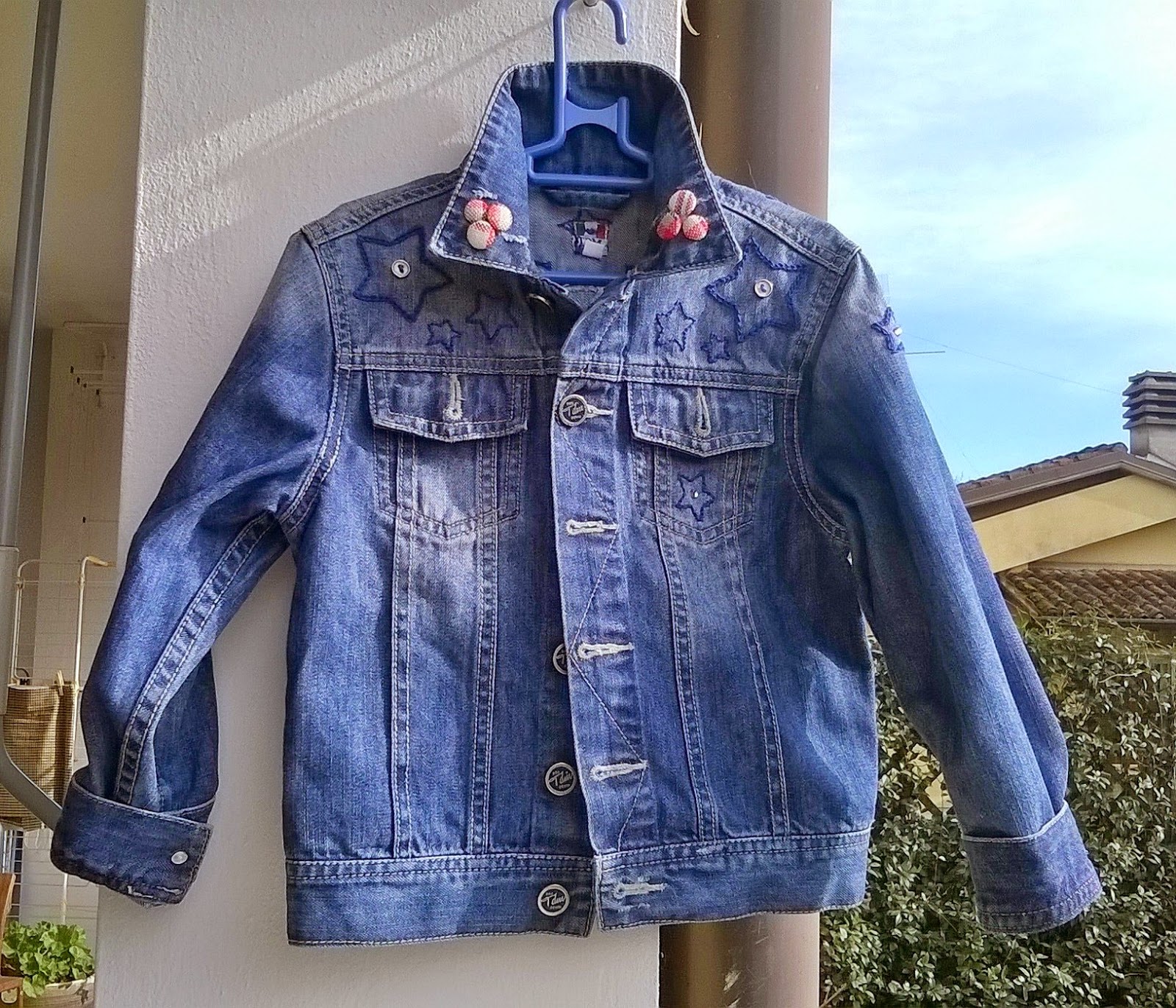 Ho ereditato per mia figlia un semplicissimo giubbino denim ed ho voluto trasformarlo un pò ricamando stelle con un filato di cotone blu del tipo da uncinetto ed applicando piccoli bottoncini in metallo anch'essi riciclati da chissà dove (stavano nella scatola dei bottoni di Lucia da tempi immemori). Anche i due piccoli strass sono superstiti recuperati dal cestello della lavatrice.